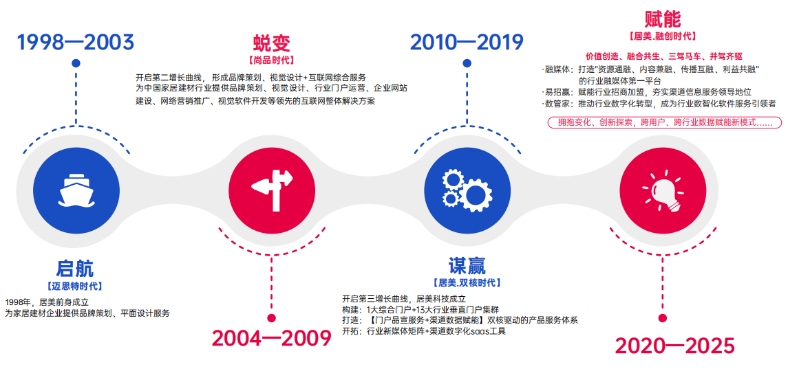 居美科技及前身始于1998年,自成立以來(lái),秉承“賦能家居,價(jià)值互聯(lián)”的企業(yè)使命,致力于成為最受信賴(lài)的家居渠道服務(wù)企業(yè),為中國家居建材行業(yè)持續賦能。累計已為超3200+家居建材企業(yè)提供了精準招商、品牌傳播、數字化工具解決方案。
